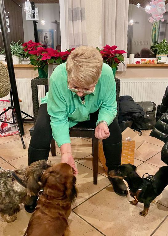 Nach dem Essen folgte die traditionelle Dackelbescherung. Dabei erhielt jeder unserer vierbeinigen Gäste von Sandra Mayer ein Leckerli sowie ein kleines Präsent, welches von der Firma VetConcept gespendet wurde.