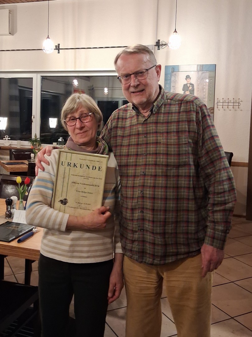 Ein emotionaler Moment der Versammlung war die Ehrung von Helga Jester mit der Silbernen Verdienstnadel des DTK. Christian Heeg übereichte sie im Auftrag des Landesvorsitzenden Michael Baus als Anerkennung für ihren unermüdlichen Einsatz im Verein – sei es beim Training, der Platzpflege, bei Veranstaltungen, mit ihren Dekorationstalenten oder mit ihren legendären Kuchen. Ein herzliches Dankeschön für all die Jahre des Engagements!